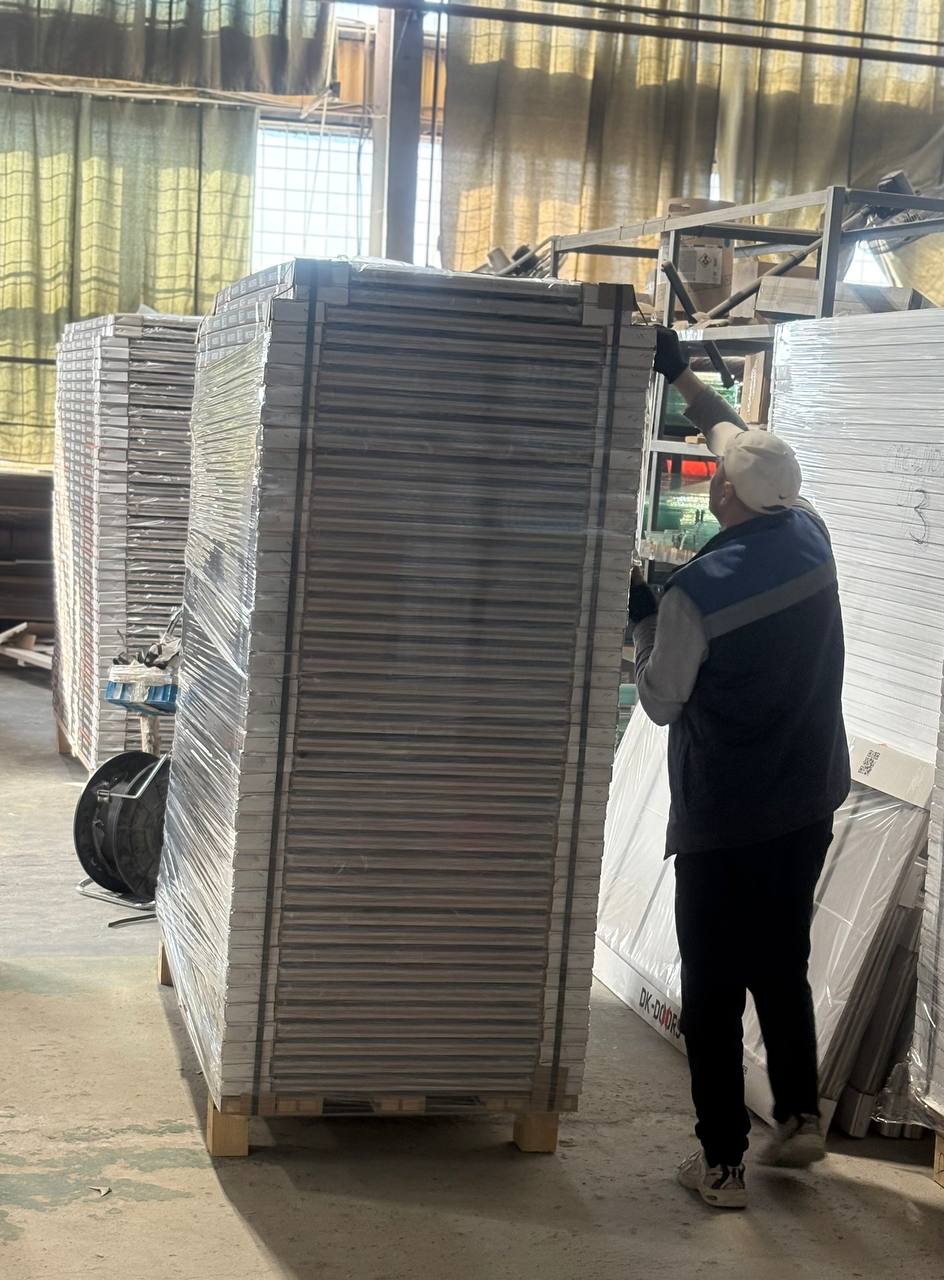 Погрузка осуществляется паллетным способом – дверные полотна и погонажные изделия укладываются на паллеты, стягиваются стреппинг лентой и дополнительно фиксируются (обматываются) стрейч-пленкой для защиты поверхностей.